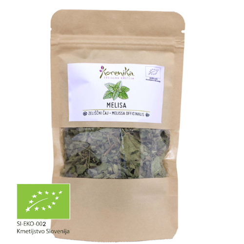 Sestavine: Posušena zel melise* (* iz kontrolirane ekološke pridelave). Nabrano in posušeno na območju Prekmurja.